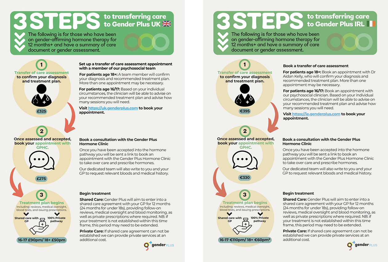 While our standard pathway involves six sessions with our psychosocial team, we do offer a dedicated pathway for those aged 16 or 17 who are already receiving gender-affirming care and who wish to transfer over to Gender Plus. We do not require you to have been on treatment for a specific period of time.